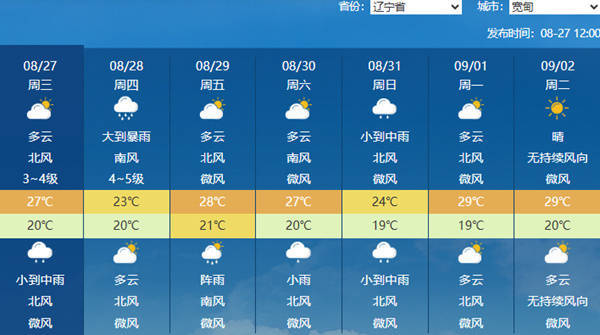 辽宁丹东、宽甸、东港未来七天天气预报。(来源:中央气象台)